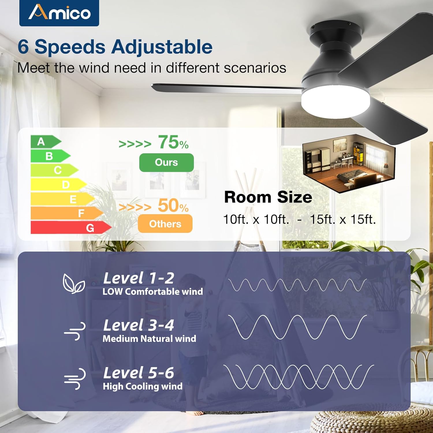 Amico Ceiling Fans with Lights, 42 inch Low Profile Ceiling fan with Light and Remote Control, Flush Mount, Reversible, 3CCT, Dimmable, Noiseless, Black Ceiling Fan for Bedroom, Indoor/Outdoor Use
