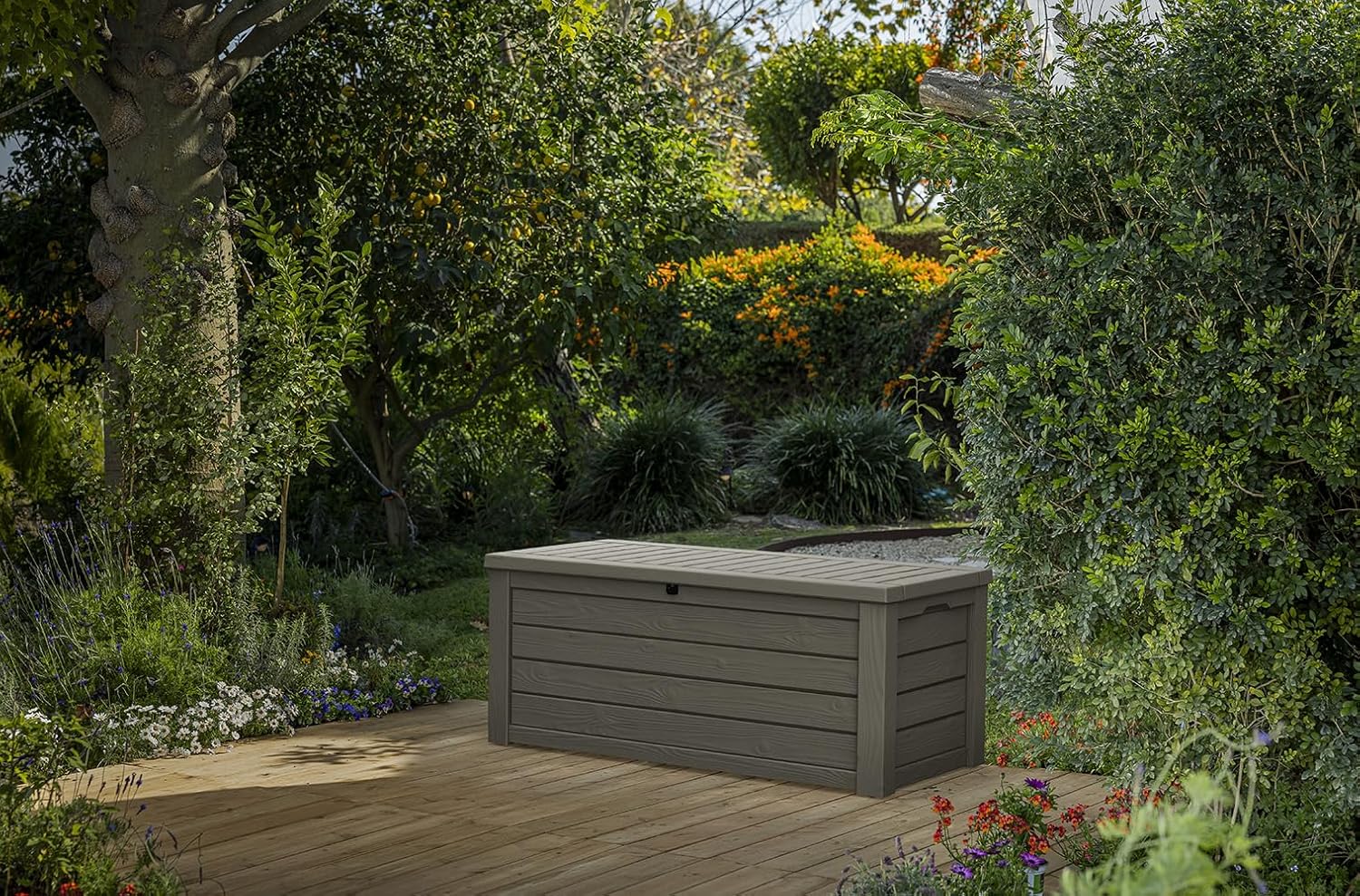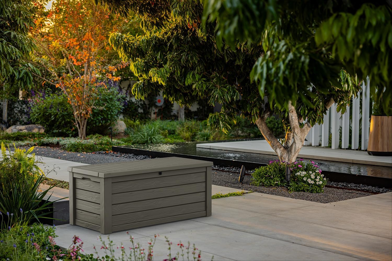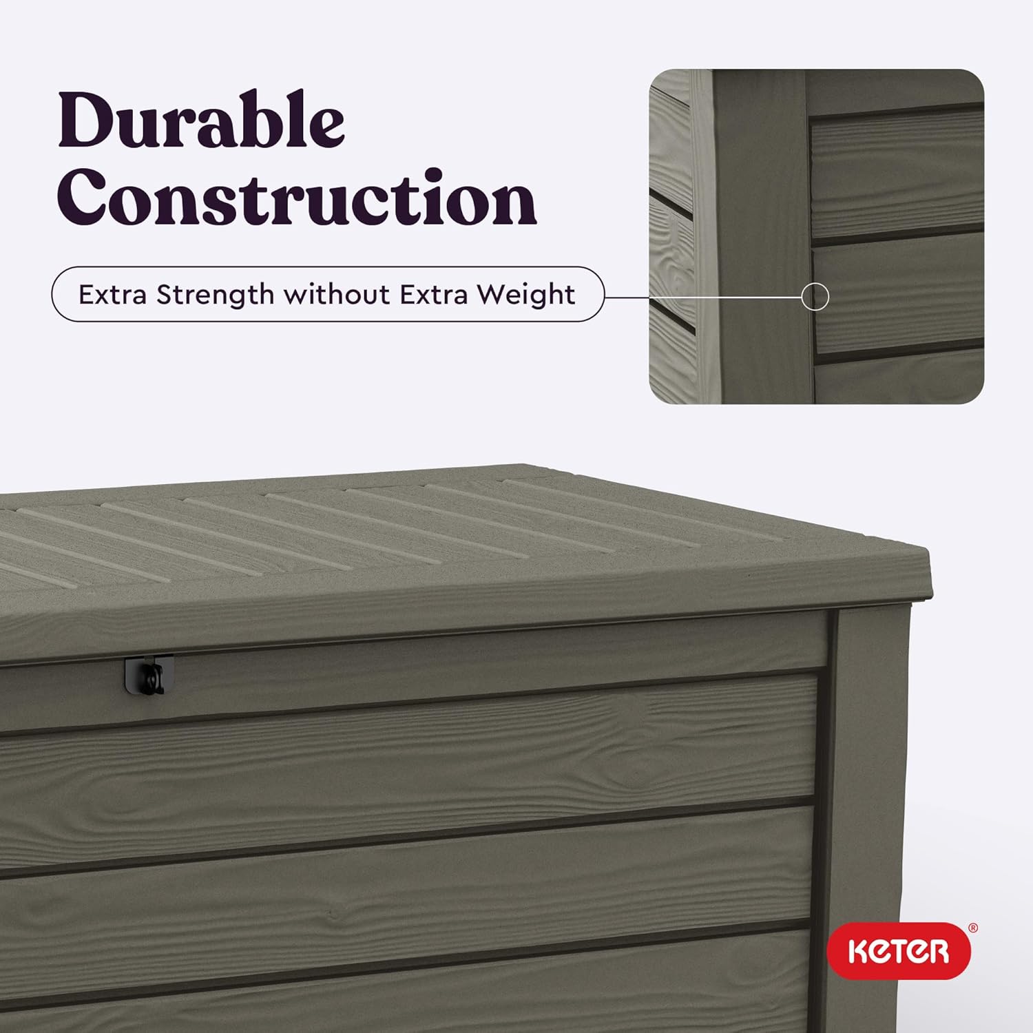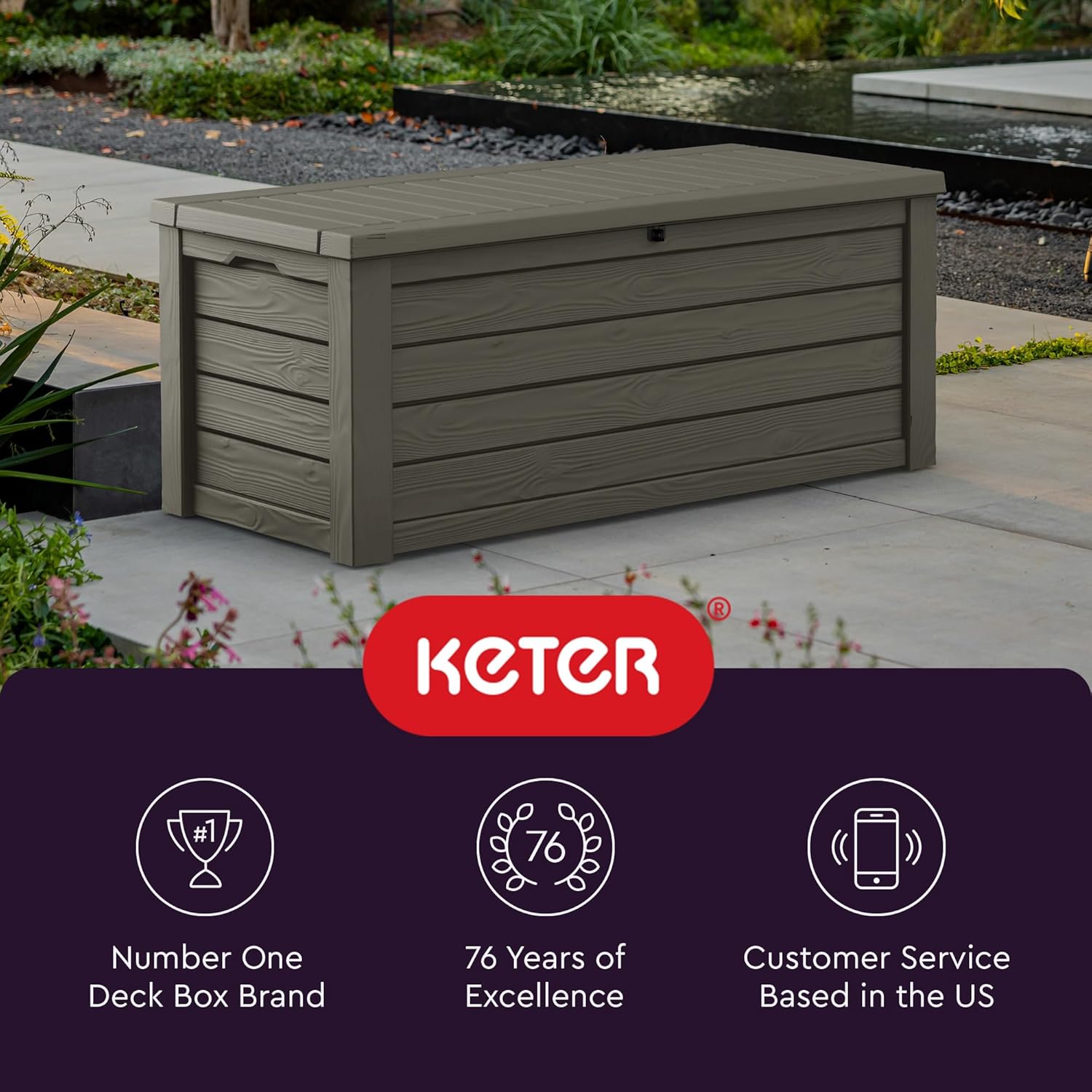 Keter Westwood 150 Gallon Resin Large Outdoor Storage Box for Patio Furniture, Outdoor Cushions, Garden Tools and Pool Floats, Taupe