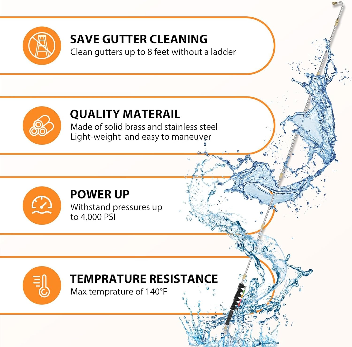 Sealegend 8FT Pressure Washer Extension Wand for Gutter Cleaning, Upgrade Power Washer Accessories with 6 Spray Nozzle Tips, 3 Gutter Cleaner Attachments Curved Rod, 1/4″ Quick Connect, 4000 PSI