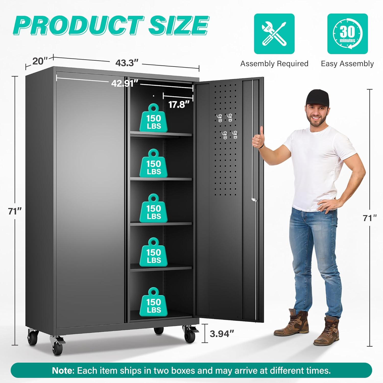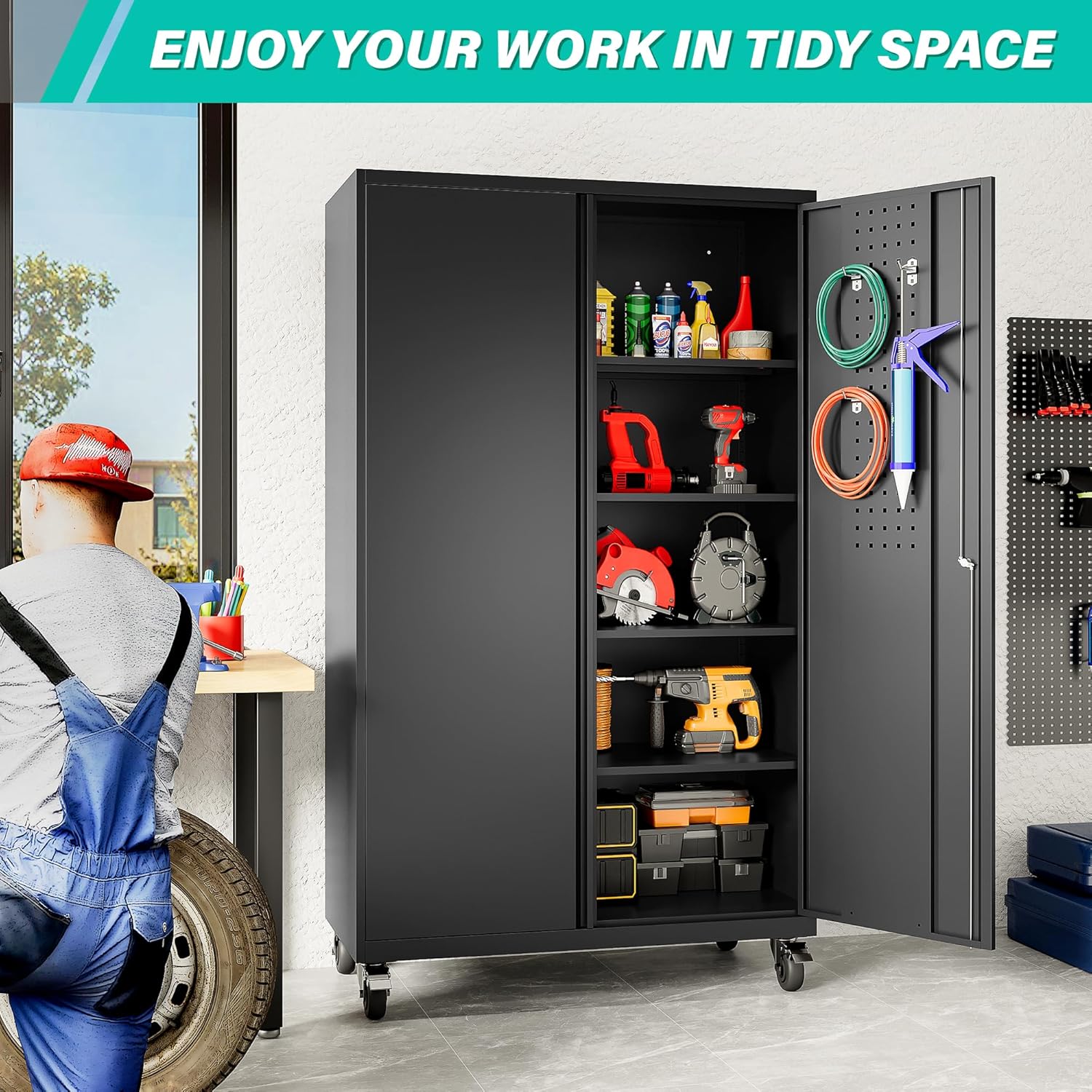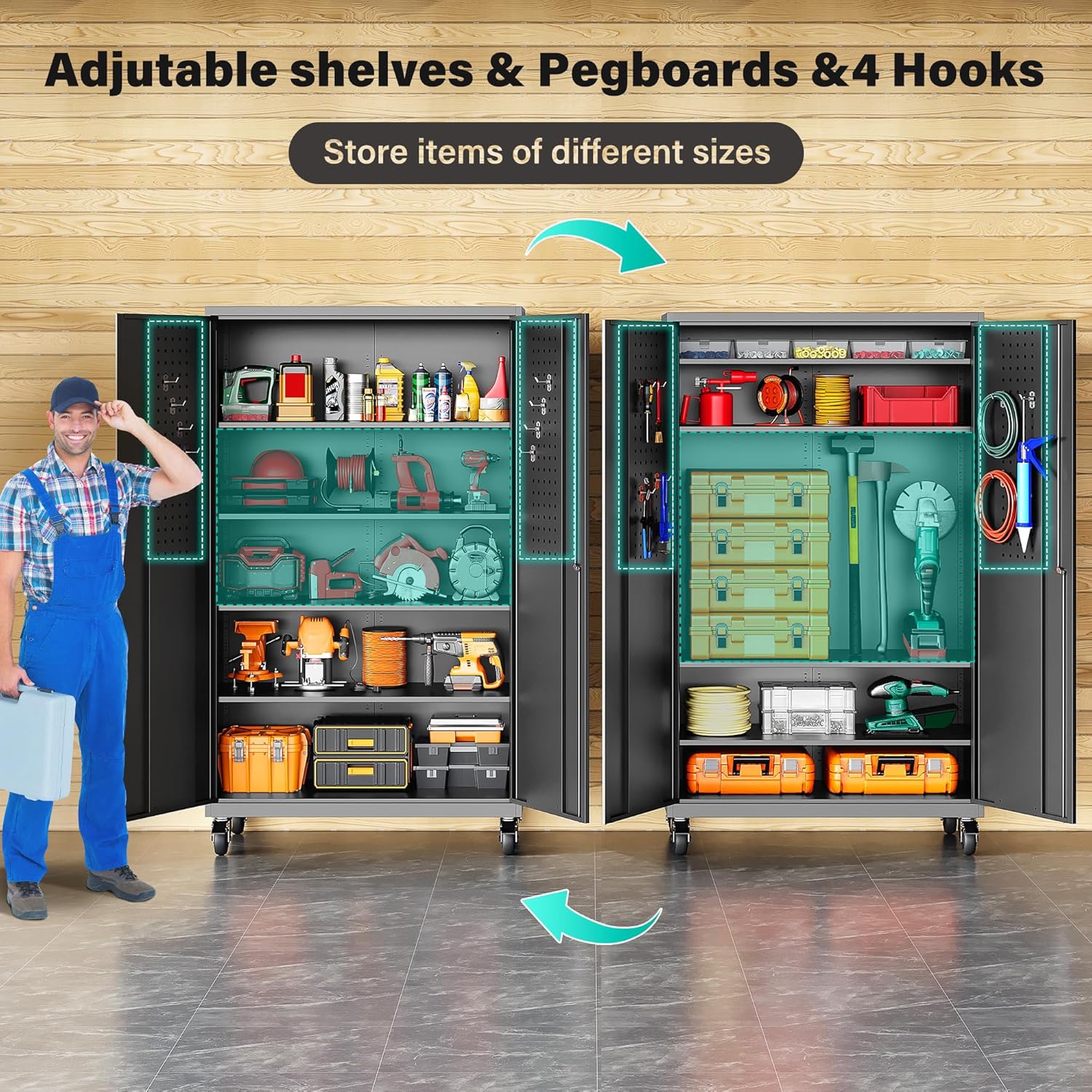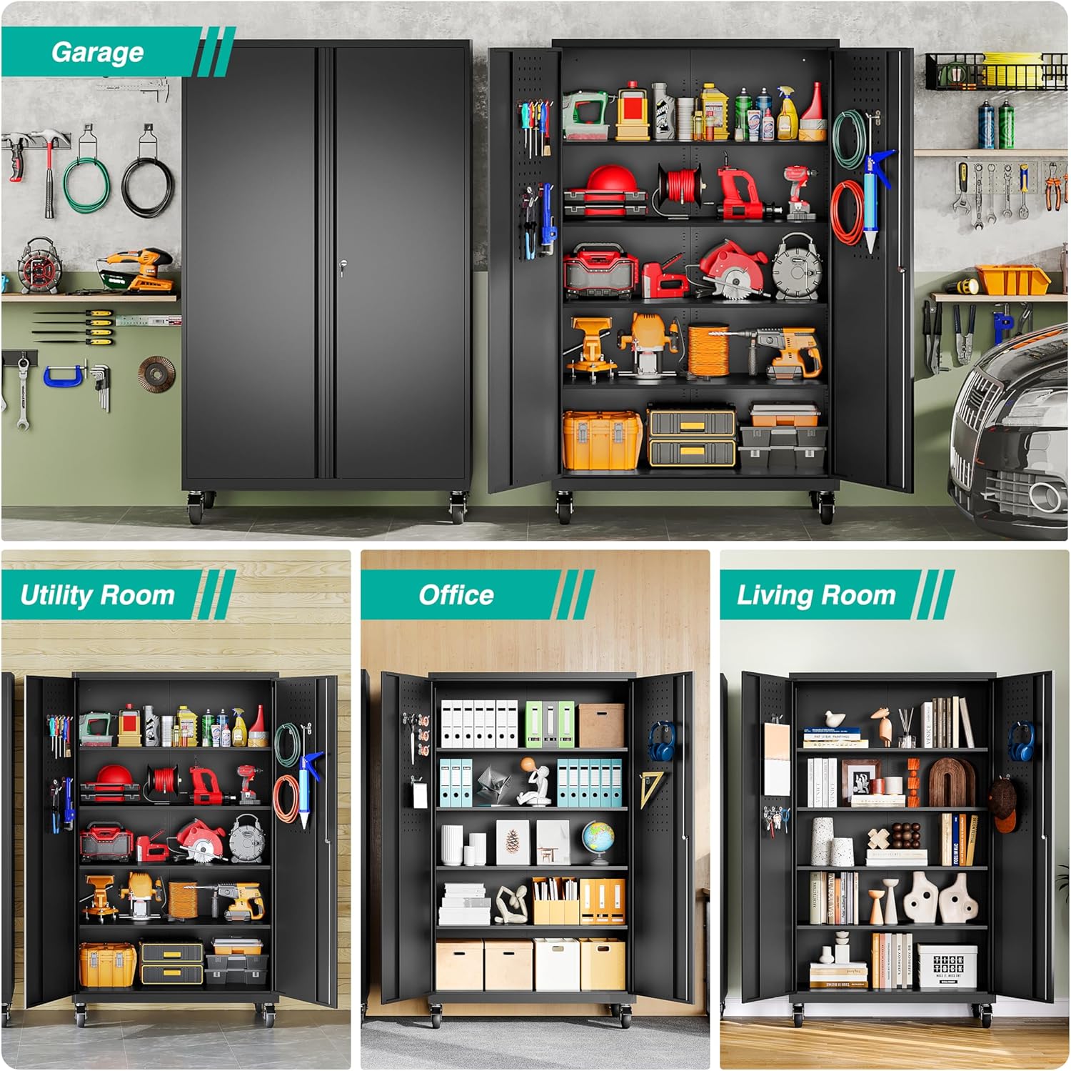 SISESOL Wide & Deep Metal Storage Cabinet with Wheels,Tall Rolling Garage Storage Cabinet with Lock,Black Metal Cabinets with Pegboards and Shelves,Tool Locker for Garage,Home,Office,43”Wx 20”Dx71″H