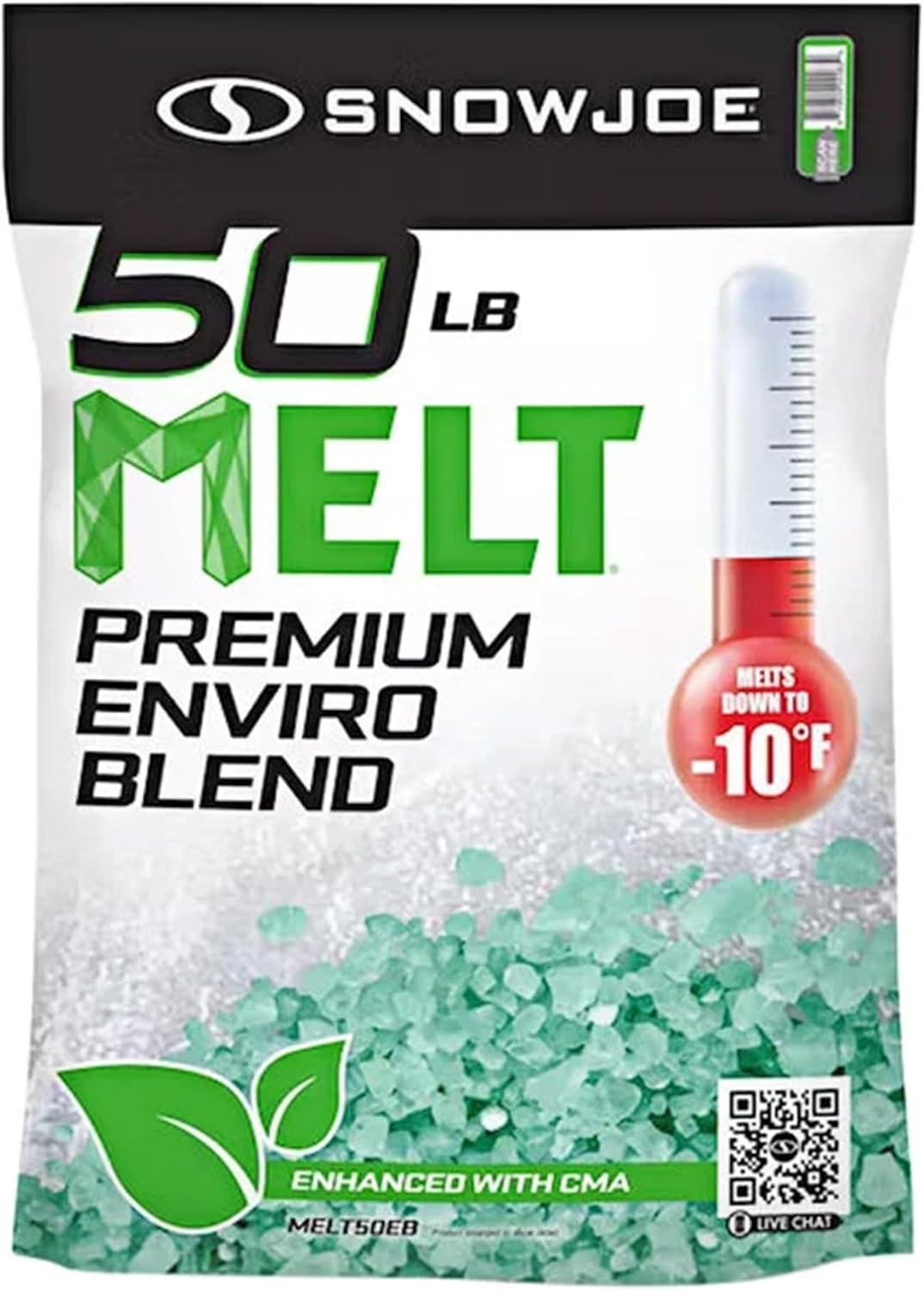Snow Joe Premium Enviro Blend Ice Melt, Green-Coated Deicer Crystals, 50 lb – Safer Melter for Vegetation, Concrete & Metals w/ Anti-Corrosion Calcium Magnesium Acetate