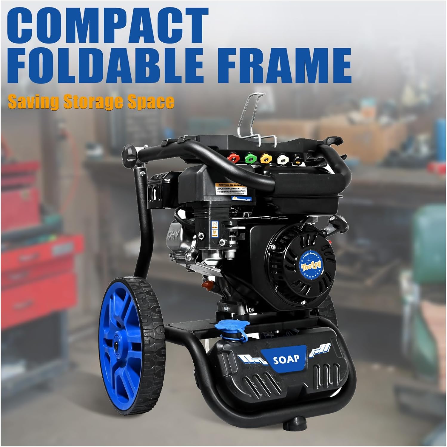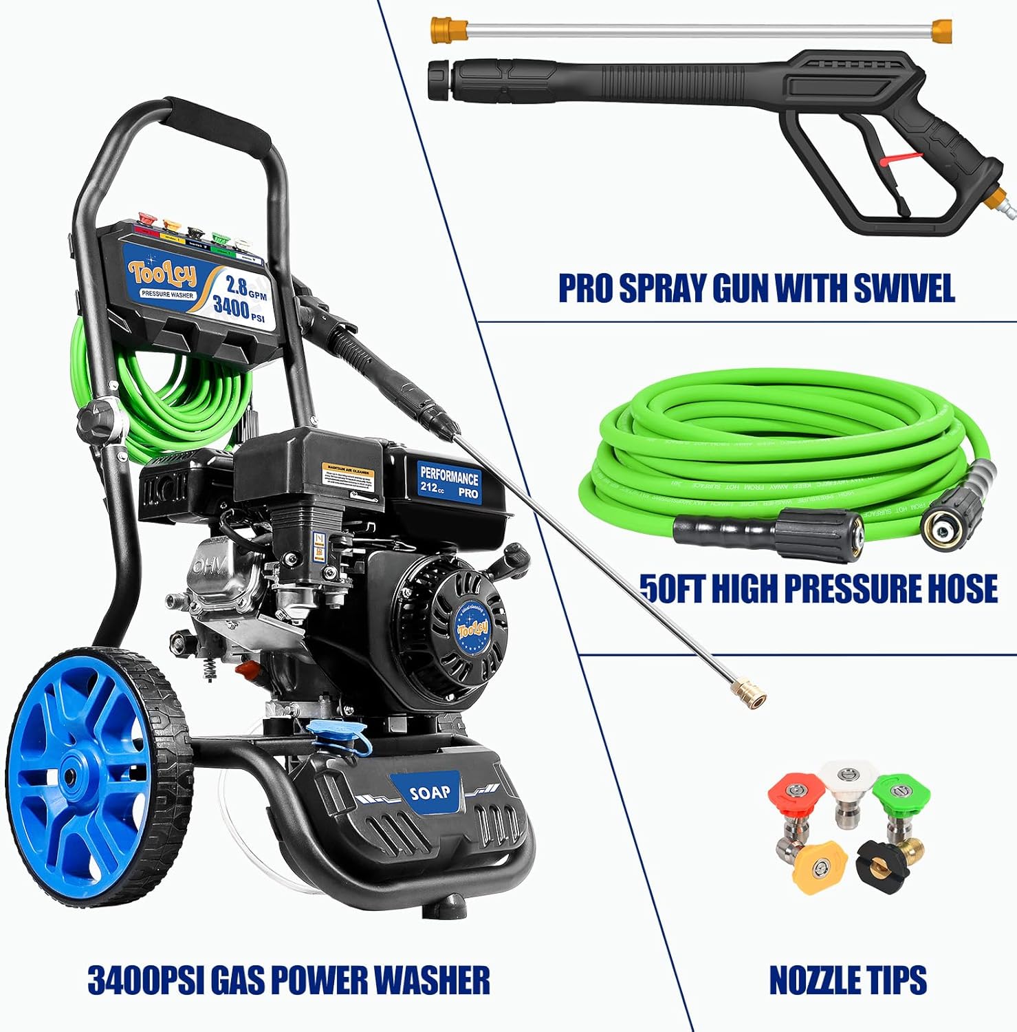 TOOLCY 3400 PSI & 2.8 GPM Gas Powered Pressure Washer with Onboard Soap Tank, Power Washer for Cleaning Cars Homes Patios Fences Driveways, Spray Gun, 5 Nozzles, 50FT Pressure Hose (Foldable Frame)